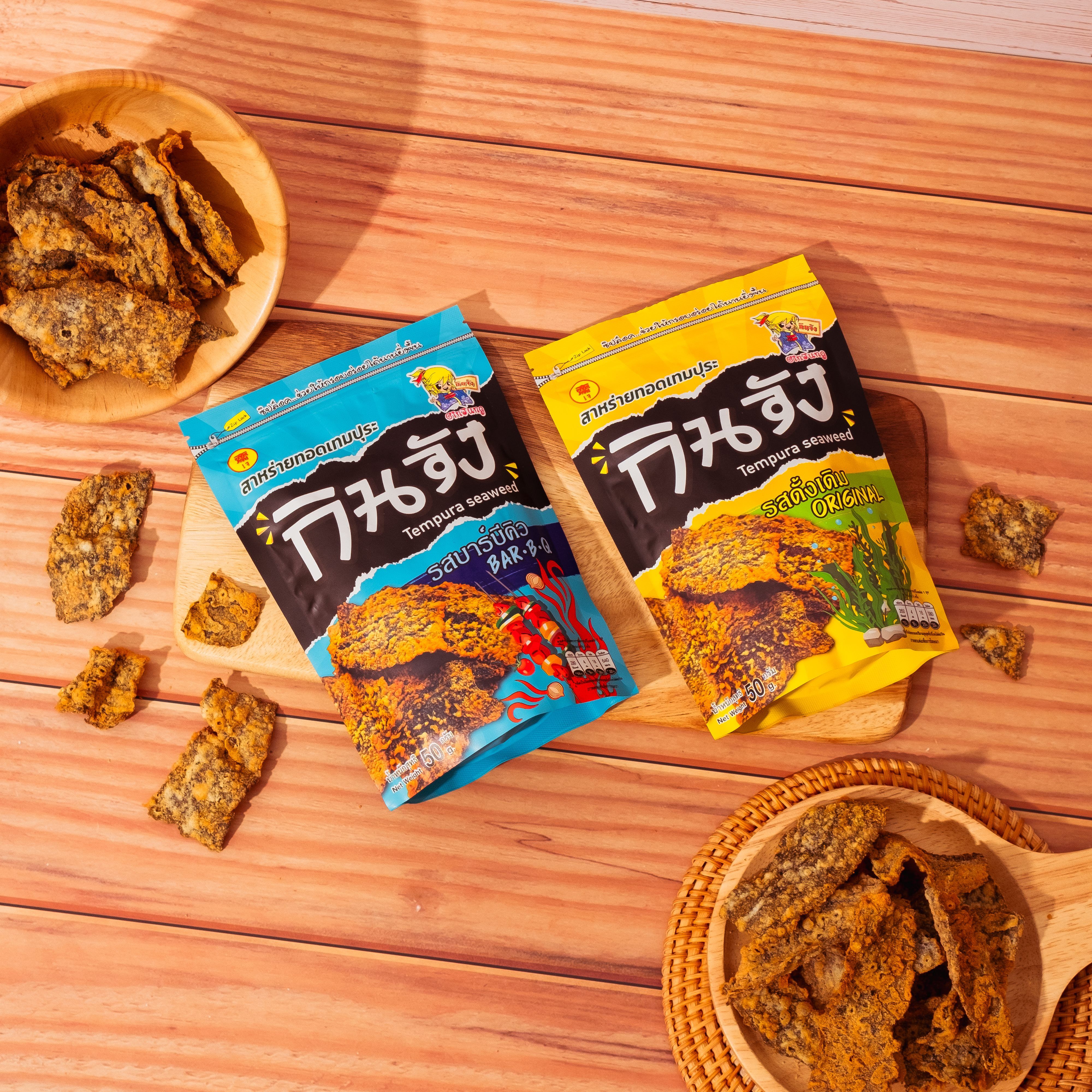 กินจัง สาหร่ายทอดเทมปุระ ผลิตจากสาหร่ายนำเข้าจากประเทศเกาหลีชุบกับแป้งสูตรพิเศษเฉพาะของทางกินจัง ทอดด้วยเครื่องจักรอันทันสมัย ซึ่งผ่านกระบวนการผลิตอย่างพิถีพิถัน เพื่อให้ได้รสชาติที่กรอบอร่อยและกลิ่นหอมเฉพาะตัว ด้วยคุณภาพของวัตถุดิบที่คัดสรรมาอย่างดีและความใส่ใจในทุกขั้นตอนการผลิต ทำให้กินจังสาหร่ายทอดเทมปุระเป็นขนมขบเคี้ยวที่ตอบโจทย์คนรักสุขภาพและรสชาติได้อย่างลงตัว สัมผัสรสชาติแท้จากทะเลและความกรอบที่ไม่เหมือนใคร เติมเต็มความสุขในทุกวันได้อย่างง่ายดาย